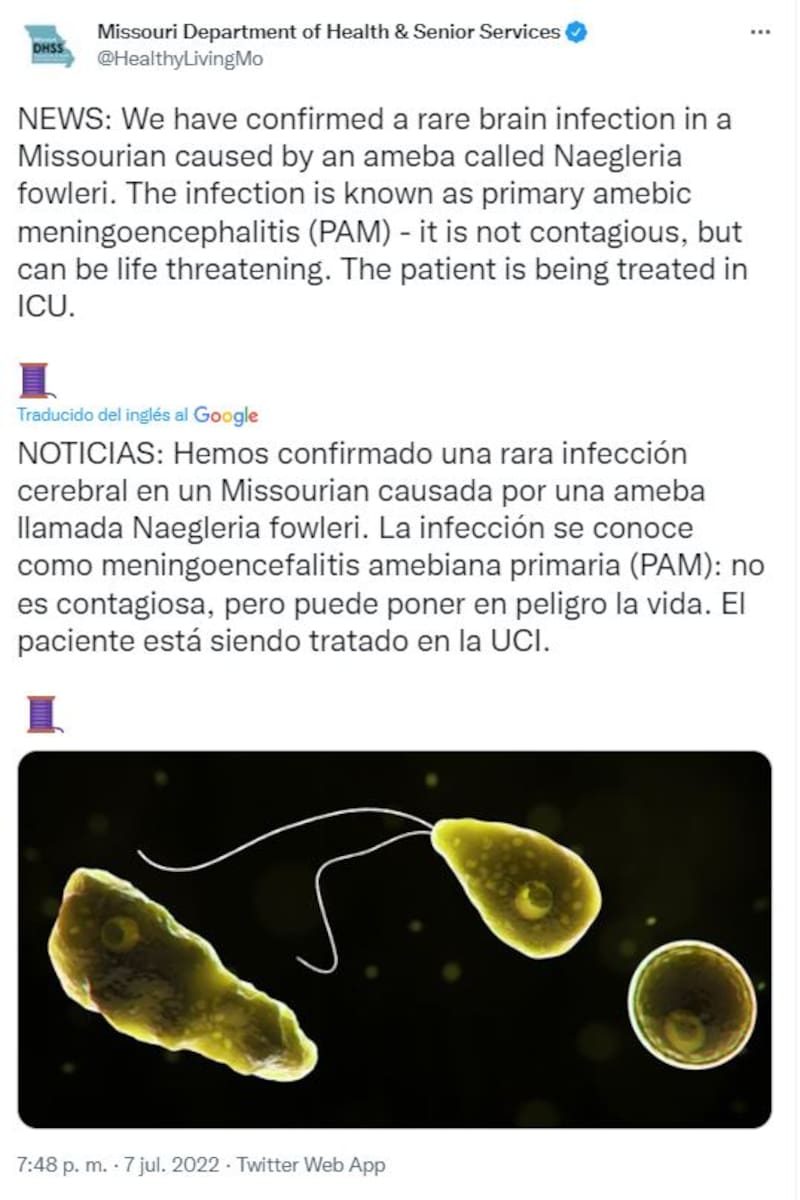 Se trata de la "naegleria fowleri", una "ameba microscópica unicelular de vida libre que puede causar una rara infección del cerebro potencialmente mortal llamada meningoencefalitis amebiana primaria (MAP)", dijo el Departamento de Salud de Iowa. Y evaluó oportuno aclarar aque "MAP es extremadamente rara. Desde 1962, solo se han identificado 154 casos conocidos en Estados Unidos".