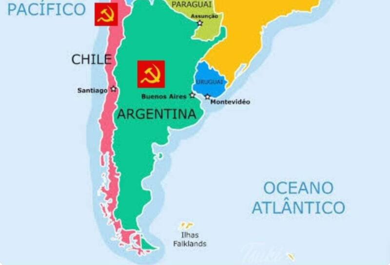 En el mapa, Eduardo Bolsonaro se refirió a las Islas Malvinas como "Falklands", y aplicó el logo comunista a varios gobiernos sudamericanos, incluyendo a Argentina, junto a Bolivia, Colombia, Chile, Perú y Venezuela.