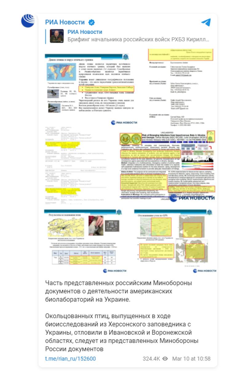 Las armas biológicas, de acuerdo a la denuncia del Kremlin, tenían como objetivo propagar la cepa de gripe H5N1 "con una tasa de mortalidad del 50%" y la enfermedad de Newcastle. "La falsificación establece que los ocupantes supuestamente expusieron planes para utilizar dos especies de aves, cuya ruta de vuelo para el invierno pasa por territorio ruso", continuó la publicación.