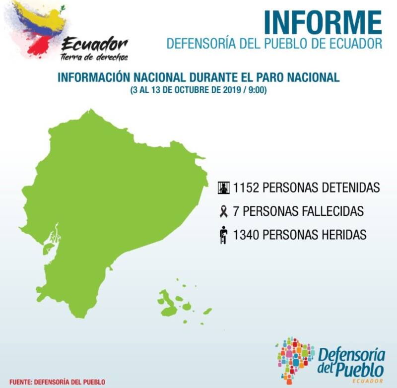 Las protestas contra el "paquetazo" del Gobierno ecuatoriano, como se conoce popularmente a las medidas de ajuste dispuestas hace 10 días por la administración de Lenin Moreno y en las que destaca la eliminación del subsidio a los combustibles, se saldaron hasta hoy con siete muertos, 1340 heridos y 1152 detenidos, reportó la Defensoría del Pueblo en su último balance.