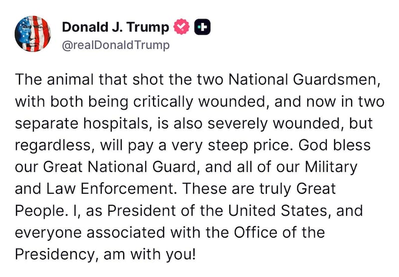 Trump, que se encontraba en Mar-a-Lago durante el feriado de Acción de Gracias, reaccionó posteriormente en su red social Truth Social con un mensaje contundente: “El animal que disparó a los dos guardias nacionales, que están gravemente heridos en dos hospitales separados, también está gravemente herido, pero independientemente pagará un precio muy alto. Dios bendiga a nuestra gran Guardia Nacional y a todas nuestras fuerzas militares y policiales”.