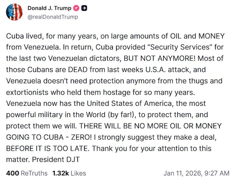 “¡NO HABRÁ MÁS PETRÓLEO NI DINERO PARA CUBA! ¡CERO! Les sugiero encarecidamente que lleguen a un acuerdo antes de que sea demasiado tarde. Gracias por su atención a este asunto”, concluyó el gobernante.