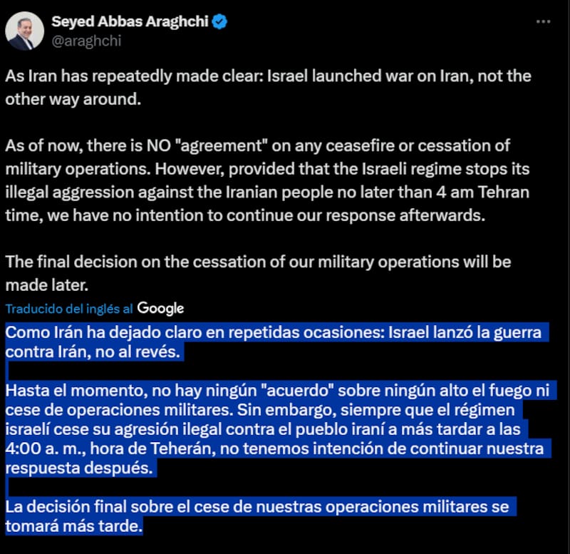 Esto fue anoche, cuando Irán marcó que, "siempre que el régimen israelí cese su agresión ilegal contra el pueblo iraní a más tardar a las 4:00 a.m. (hora local), no tenemos intención de continuar nuestra respuesta después".