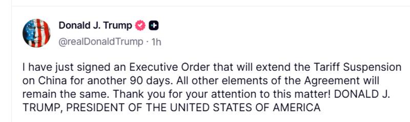 El mandatario norteamericano publicó en su plataforma Truth Social que firmó la orden ejecutiva para la extensión, y que "todos los demás elementos del acuerdo permanecerán iguales". Beijing también anunció la pausa arancelaria por medio de la agencia de noticias oficial Xinhua.