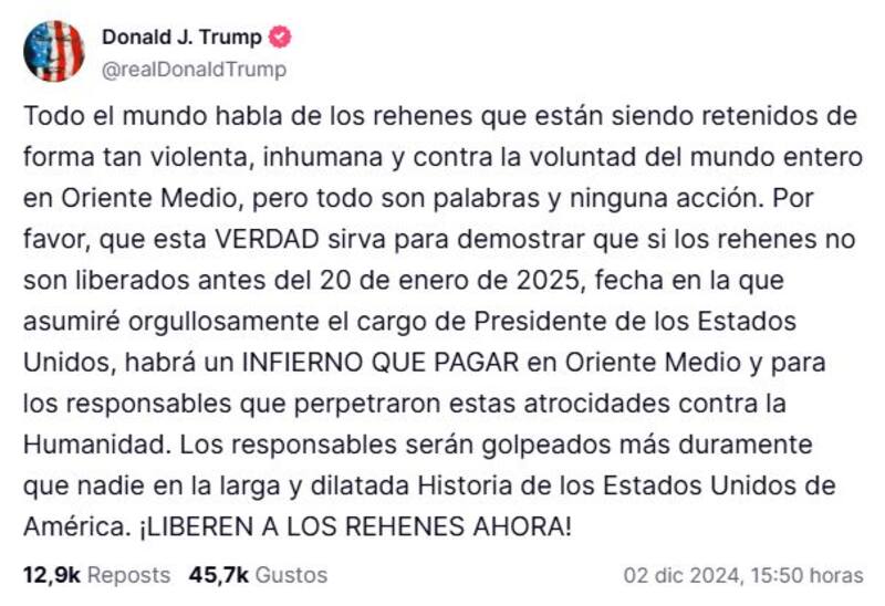 "Si los rehenes no son liberados antes del 20 de enero de 2025, fecha en la que asumo con orgullo el cargo de presidente de Estados Unidos, habrá TODO UN INFIERNO que pagar en Oriente Medio y para aquellos responsables que perpetraron estas atrocidades contra la humanidad", dijo el mandatario electo en su red social, Truth Social.