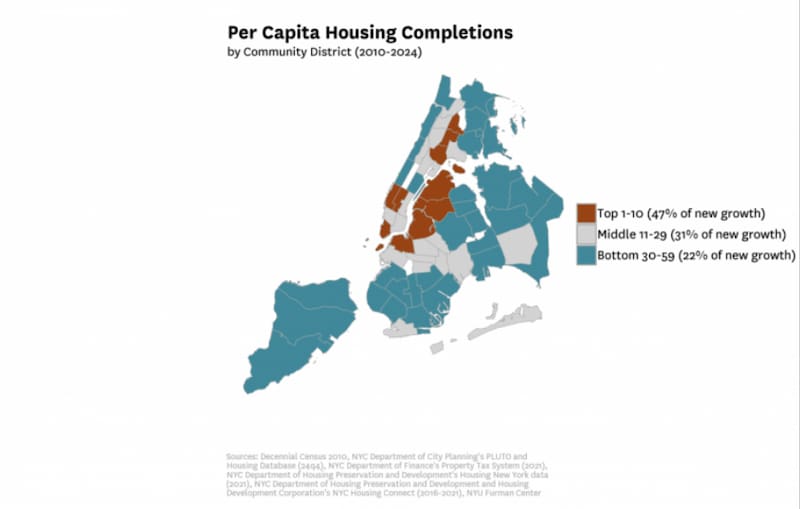 La crisis habitacional en Nueva York alcanzó niveles críticos en 2025. Según el NYU Furman Center, la tasa de vacancia cayó al 1,4%, la más baja desde 1986, y el 58% de los neoyorquinos vivió en barrios que aportaron solo el 22% del crecimiento del parque habitacional en la última década. Según el informe "10 distritos comunitarios (de los 59 que tiene la ciudad), que albergan solo 13% de la población, fueron responsables del 47% del crecimiento del stock de viviendas. En cambio, la mitad de los distritos, con 58% de la población, solo aportaron 22% del crecimiento".