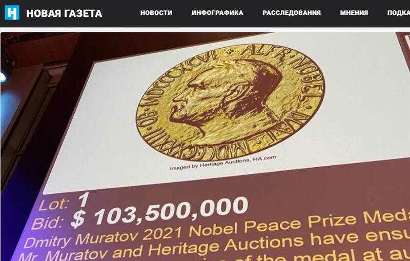 El editor ruso Dimitri Muratov,ganador del Premio Nobel de la Paz en 2021 por defender la libertad de expresión, decidió subastar la medalla que le habían conferido con el objetivo de recaudar fondos para los refugiados ucranianos por la invasión del Ejército de Rusia.