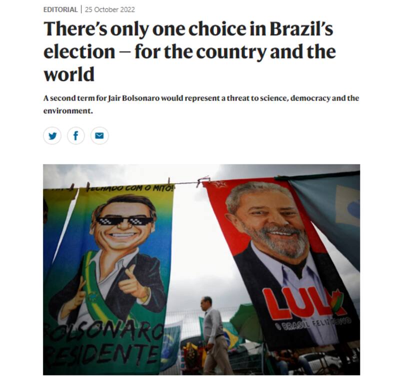 Las políticas científicas aplicadas por su rival en el balotaje del próximo domingo, el ex mandatario Luiz Inácio Lula da Silva, por el contrario, permitieron "grandes progresos en esa materia que Bolsonaro desmanteló", agregó la revista, que se publica desde 1869.