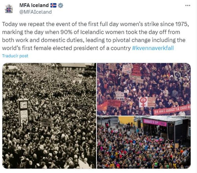 Ante la movilización, el presidente, Guoni Thorlacius Johannesson, expresó que el "activismo de las mujeres sigue cambiando la sociedad para mejor" y recordó, a través de sus redes, la gran marcha que tuvo lugar en el país en 1975. Esa movilización propició queVigdis Finnbogadottir fuera elegida presidenta en 1980, para convertirse en la primera jefa de Estado de la historia.