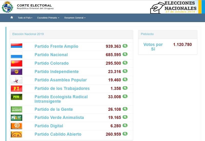 Con el 100% de los circuitos escrutados, el candidato presidencial del oficialista Frente Amplio (FA), Daniel Martínez, obtenía el 39,2% de los votos frente al candidato del Partido Nacional (PN), Luis Lacalle Pou, con 28,6%, seguido de Ernesto Talvi del Partido Colorado (PC) con 12,3% y Guido Manini Ríos de Cabildo Abierto (CA) con 10,9%.