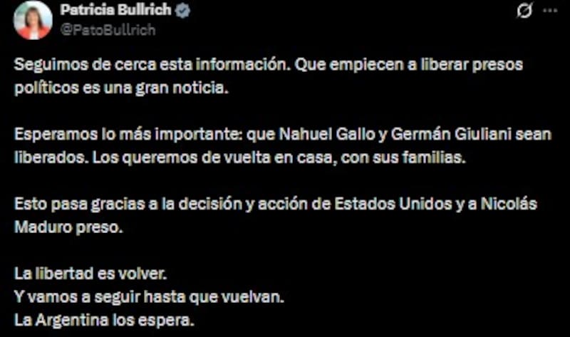 “Seguimos de cerca esta información. Que empiecen a liberar presos políticos es una gran noticia. Esperamos lo más importante: que Nahuel Gallo y Germán Giuliani sean liberados. Los queremos de vuelta en casa, con sus familias”, escribió Bullrich en su cuenta de X.