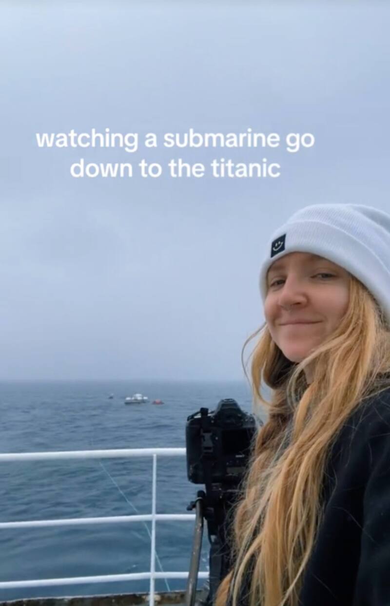 "Mirando el submarino que baja para ver al Titanic": escribió la joven dentro del video viral en la que se la ve a ella arriba de lo que parece ser un barco o un muelle de la región de Terranova, en Canadá.