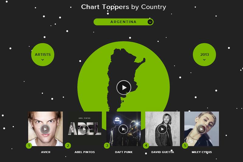 De todas maneras, del 80 por ciento de las canciones que si fueron escuchadas se desprenden varias estadísticas sobre el consumo de los usuarios. En la Argentina, el DJ Avicii se destaca como una de las figuras más importantes. De hecho cuenta con dos temas dentro de los cinco más escuchados. El ranking lo lidera Wake Me Up, de Avicii, seguido por Get Lucky de Daft Punk, Roar de Katy Perry, Wrecking Ball de Miley Cyrus y en el quinto puesto otra vez aparece el DJ sueco con su canción You Make Me.