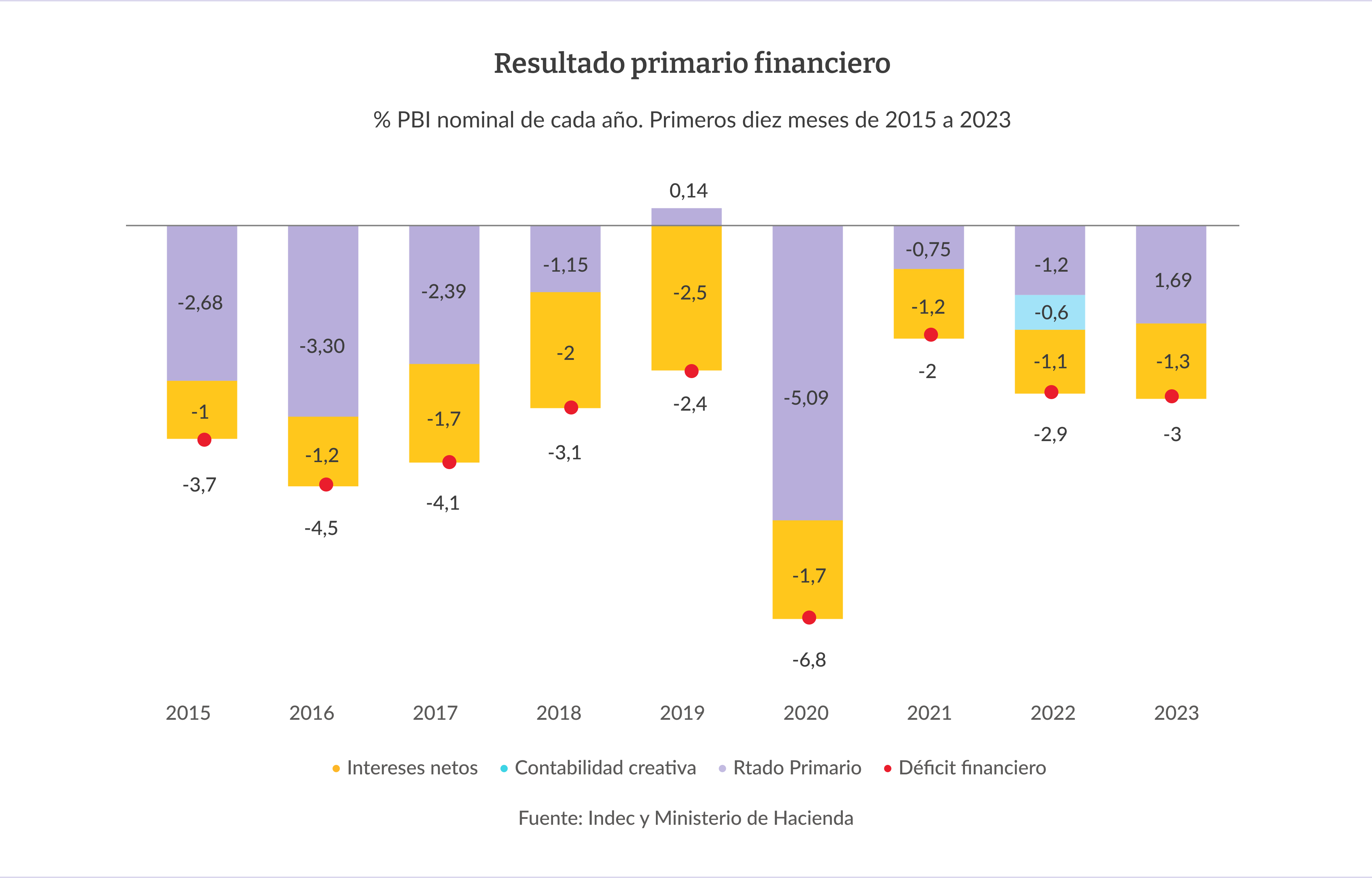 El déficit fiscal, en tanto, llegó al equivalente a 1,7% del Producto Interno Bruto (PIB) en cuanto al resultado primario, y a 3% en el resultado financiero acumulado a octubre, según los datos de Gabriel Caamaño, de la consultora Ledesma. En todo 2023, el déficit financiero podría rondar el 5%.