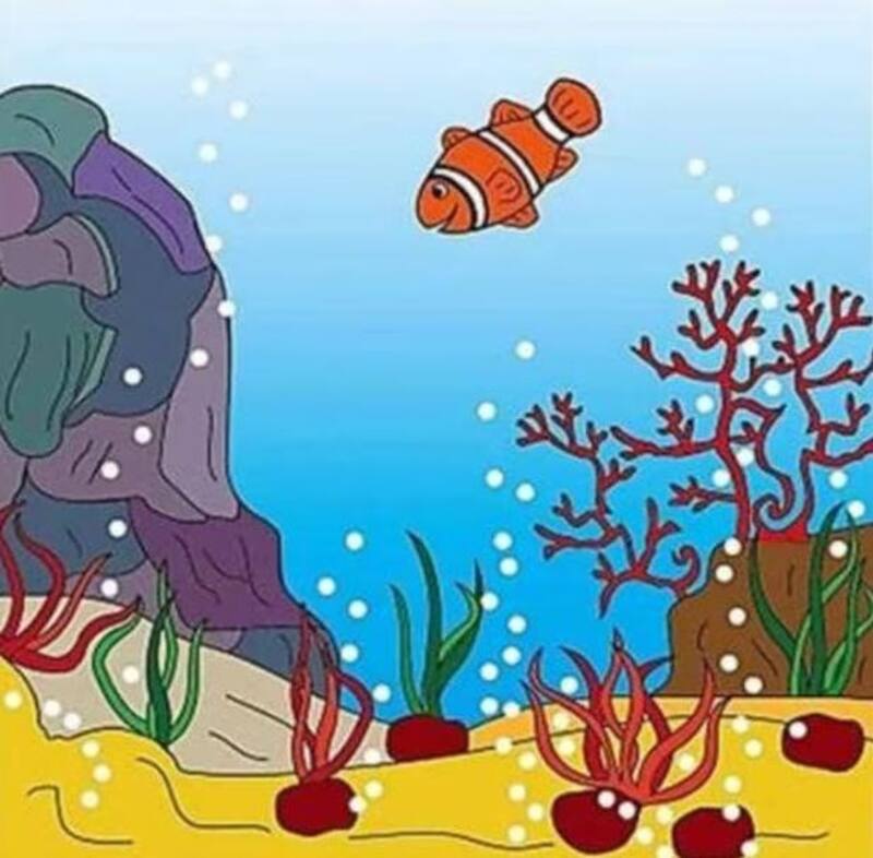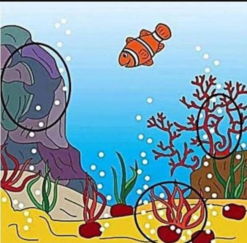 Una pista: prestá mucha atención a las formas, ya que en los detalles está la respuesta. Debes encontrar: un pulpo, un caballito de mar y un delfín.