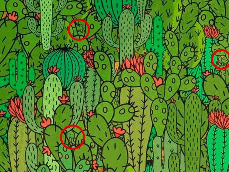En las últimas semanas, este reto visual se ganó las preferencias de miles de usuarios en las redes sociales. En esta imagen tienes que prestar mucha atención para encontrar a los tres animales escondidos entre los cactus. Específicamente son una rana, una serpiente y una tortuga.