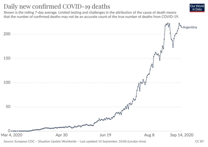 Los datos de Our World in Data dejaron al desnudo la falta de tests a asintomáticos, rastreos masivos y aislamiento. En el reporte vespertino del 14 de septiembre, el Ministerio de Salud registró 565.446 casos totales.