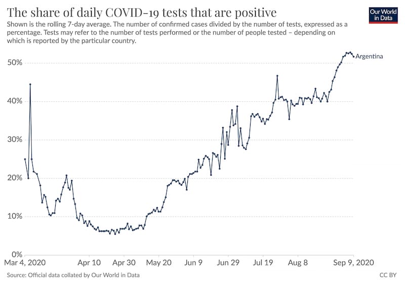 Argentina es el país con la mayor tasa de positividad de COVID-19 en el mundo con un 51,7% de positividad. El informe de Our World in Data fue actualizado este 9 de septiembre y sugiere que el país no tiene una correcta definición de caso sospechoso y realiza un mal seguimiento de contactos estrechos.