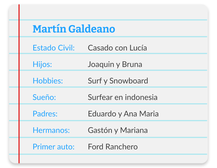 Estar al mando de un desafío de esta magnitud es también estar acompañado por un equipo y por una familia. Recorriendo su vida, conocemos el cable a tierra de Galdeano: sus hijos, Bruna y Joaquín, y sus vivencias en la nieve; su fanatismo por el fútbol; y los viajes familiares junto a Lucía, su compañera de vida. Su familia es quien lo acompañó a destinos recónditos, a transitar nuevos puestos dentro de Ford y quienes son su refugio al llegar a casa.