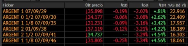 Con estas nuevas bajas, los bonos en dólares de ley extranjera ya acumulan pérdidas de entre 2% y 3,3% en las últimas cinco ruedas, siendo el tramo medio y largo los más afectados.