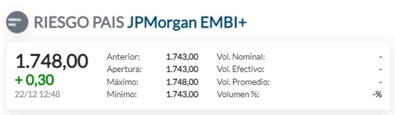 Ante este nuevo deterioro de los bonos, el riesgo país argentino vuelve a apuntar al alza. El índice que mide JP Morgan avanza cinco unidades hasta los 1748 puntos básicos.