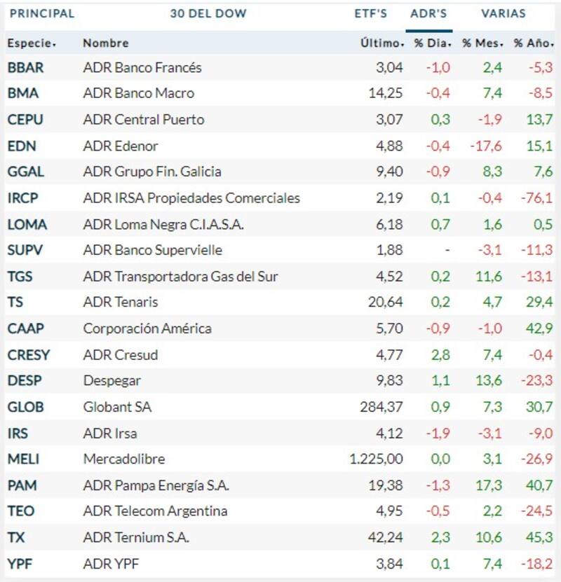 En Wall Street, donde el Dow Jones, el S&P 500 y el Nasdaq crecen entre 0,5% y 0,6%, los ADR locales muestran una tendencia ligeramente positiva, en una rueda en la que apenas sobresalen los avances de Cresud y Ternium. Sin embargo, ninguno supera el 3%.