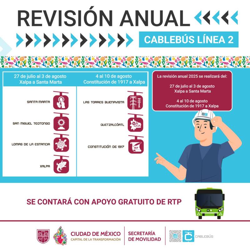 De acuerdo a su más reciente comunicado, "A partir del 27 de julio y hasta el 10 de agosto", siete estaciones estarán cerradas debido al inicio de la "revisión anual en la Línea 2 de Mi Cablebús CDMX". Para contener a los miles de usuario se ven afectados por estos cierres, las autoridades correspondientes podrán redes de apoyo de la Red de Transporte de Pasajeros-RTP.