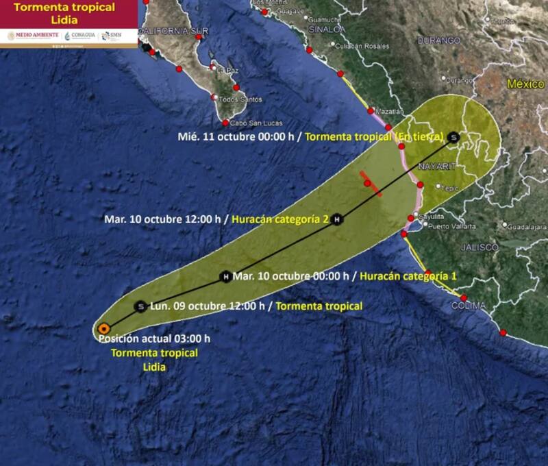 En lo que respecta a la tormenta tropical "Lidia", que se localiza al suroeste de la Península de Baja California, las lluvias intensas a torrenciales y los fuertes vientos podrían impactar durante la noche del martes y la madrugada del miércoles en los siguientes estados: