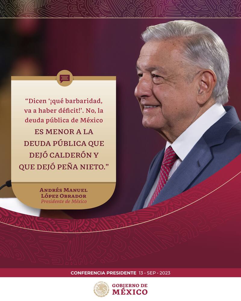 Y además agregó: "Eran estos grupos los que dominaban y se dedicaban a saquear, a robar". El presidente afirmó que habrá inversión y que no será con endeudamientos: "Dicen ‘¡Qué barbaridad, va a haber déficit!'. No, la deuda pública de México es menor a la deuda pública que dejó Calderón y que dejó Peña Nieto".