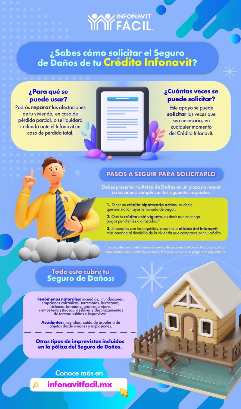El Seguro de Daños de Infonavit cubre de posibles eventualidades a los derechohabientes que hayan comprado una vivienda mediante un crédito hipotecario. El fin del programa es proteger el patrimonio de los afiliados, ante eventos relacionados con accidentes o fenómenos naturales.