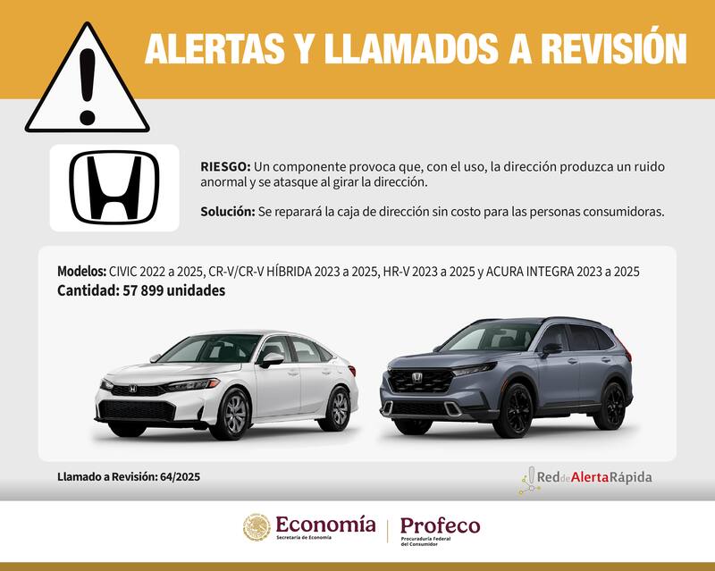 El llamado, que no tiene costo para los consumidores, incluye 57,899 unidades de modelos muy vendidos en el país, entre ellos el Honda Civic (2022-2025), CR-V y CR-V Híbrida (2023-2025), HR-V (2023-2025), así como el Acura Integra (2023-2025). Los propietarios deberán acudir a los concesionarios autorizados donde se reparará la falla de manera gratuita.