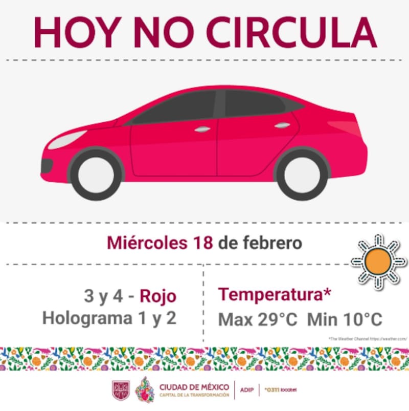 El miércoles 18 de febrero no podrán circular los vehículos con terminación de placa 3 y 4, engomado rojo, que cuenten con holograma de verificación 1 y 2. Esta medida forma parte del esquema regular del programa ambiental en la capital.