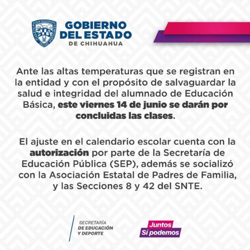 "Ante las altas temperaturas que se registran en la entidad y con el propósito de salvaguardar la salud e integridad del alumnado de Educación Básica, este viernes 14 de junio se darán por concluidas las clases", confirmó el Gobierno local. Y remarcó que el ajuste al calendario "cuenta con la autorización por parte de la SEP", además de ser transmitido a "la Asociación Estatal de Padres de Familia y las secciones 8 y 42 del SNTE", informaron las autoridades del estado de Chihuahua.