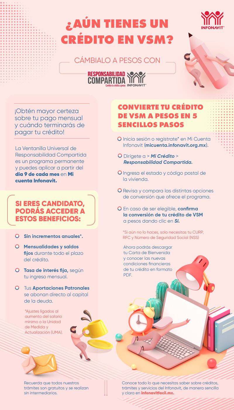 Con el objetivo de favorecer el orden de las cuentas de los trabajadores y promover una óptima administración de los recursos, Infonavit recuerda a través de su sitio web las ventajas de cambiar un crédito VSM a pesos.