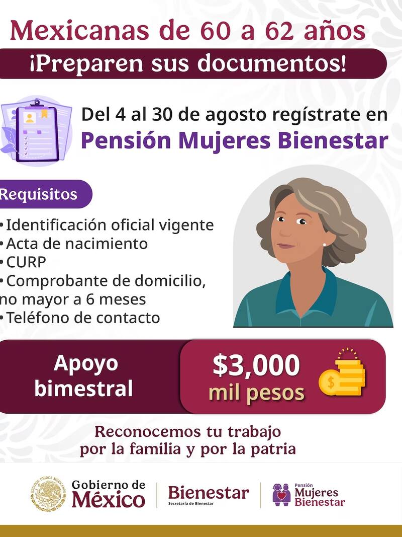 De acuerdo con la información oficial, los registros para la Pensión Mujeres Bienestar se llevarán a cabo del lunes 4 al sábado 30 de agosto de 2025. El programa está dirigido a mujeres de 60 años o más, en especial a aquellas que residen en localidades con población mayoritaria indígena o afromexicana. Inicialmente, el apoyo estaba destinado únicamente para quienes tenían entre 63 y 64 años.
