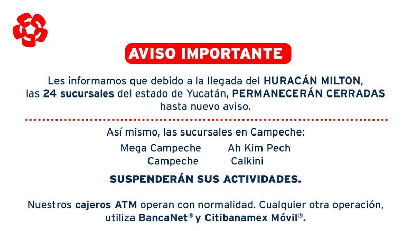 "Para Citibanamex, la seguridad de sus clientes, empleados y visitantes es lo más importante. Toma en cuenta las medidas de prevención que implementamos ante la llegada del Huracán Miltón a la Península de Yucatán", así lo dejó en claro la entidad bancaria.