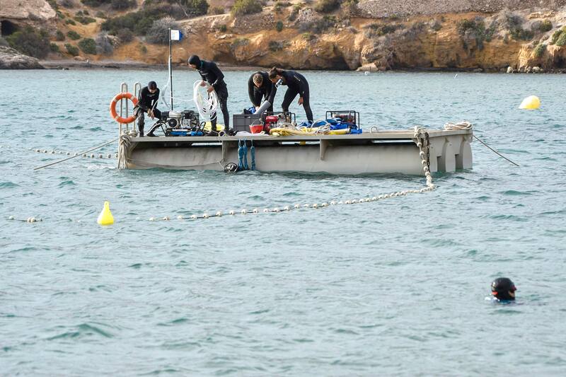 Una vez sacadas del agua, es imprescindible que las piezas no pierdan la posición horizontal y también que no se sequen, por lo que serán trasladadas al laboratorio del Museo Nacional de Arqueología Subacuática (ARQUA), en Cartagena (sureste), o bien sumergidas en cubetas, como en caso del fragmento extraído hoy, o bien envueltas en un film plástico para preservar la humedad.