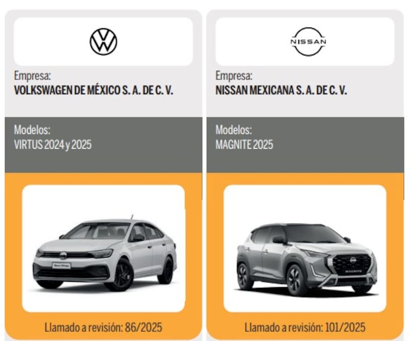A través de la Revista al Consumidor, una publicación mensual en la cual se busca brindar asesoramiento a los mexicanos en materia de consumo y ahorro, la PROFECO emitió un llamado a revisión en conjunto con las empresas Volkswagen de México S. A. de C. V. y Nissan Mexicana S. A. de C. V, por algunas fallas registradas en los siguientes modelos: