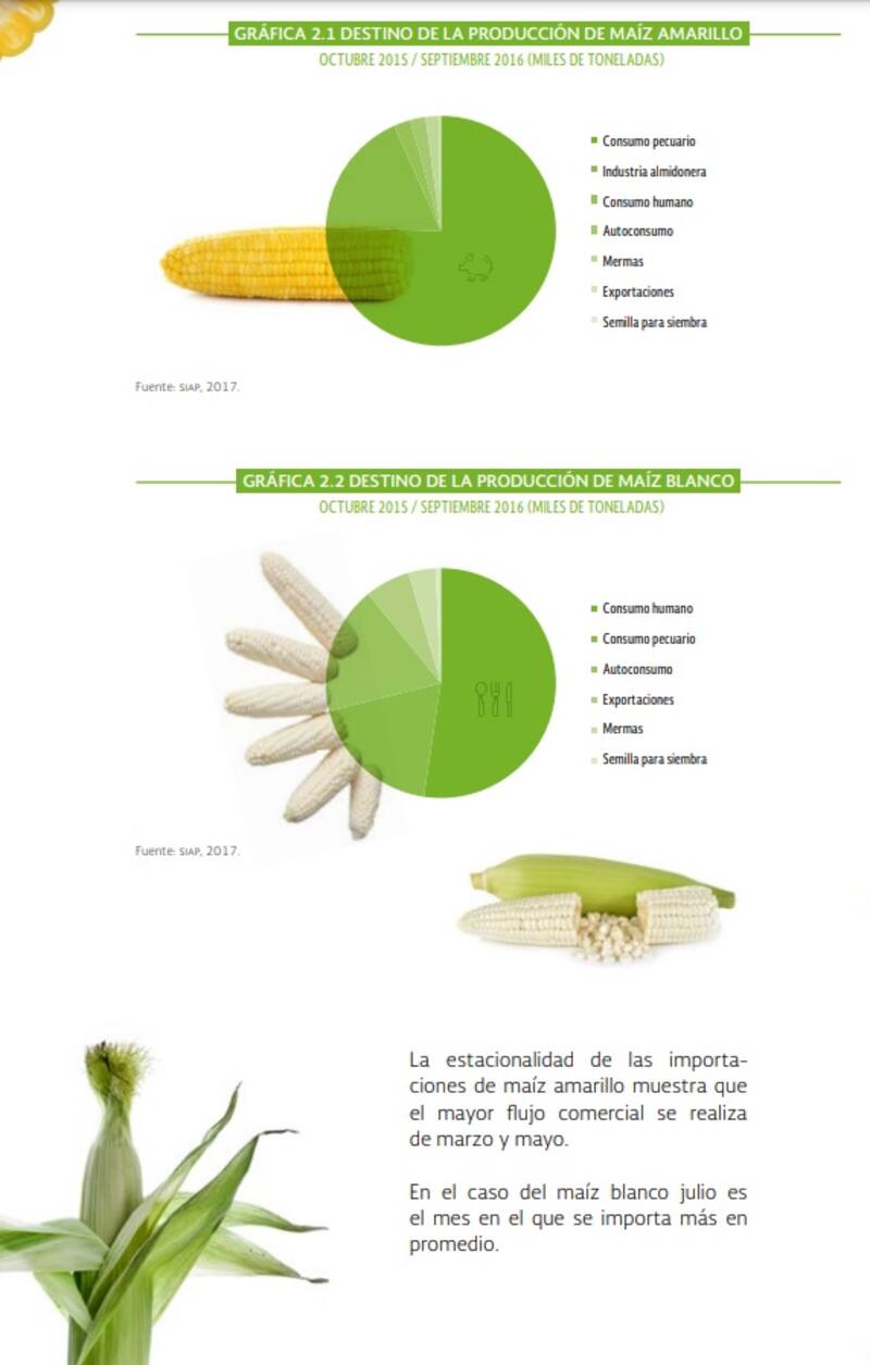 Según un informe del Gobierno de México, entre el maíz blanco y el amarillo, "el maíz blanco representa 86.94% de la producción y se destina principalmente al consumo humano y el maíz amarillo satisface solo el 24% de los requerimientos nacionales".