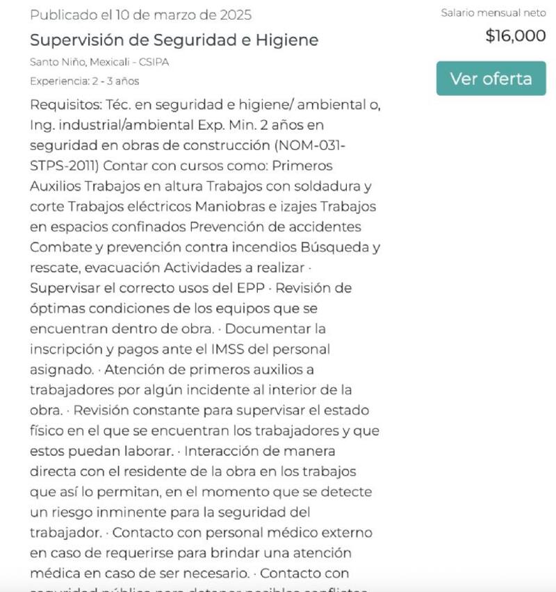 La oferta es por el puesto de técnico en seguridad e higiene y está orientada a los habitantes de Mexicali, Baja California. Un dato que ha despertado interés entre los aspirantes es que no sólo permite la postulación de adultos mayores sino también de personas con discapacidad.