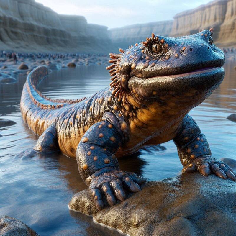 En las zonas más cálidas y secas del planeta, los animales evolucionaban hacia nuevas formas, y los primeros vertebrados cuadrúpedos, llamados tetrápodos troncales, se ramificaron y dividieron en linajes que después se convertirían en mamíferos, reptiles y anfibios, pero en la periferia, en lugares como la actual Namibia, quedaron formas más antiguas.