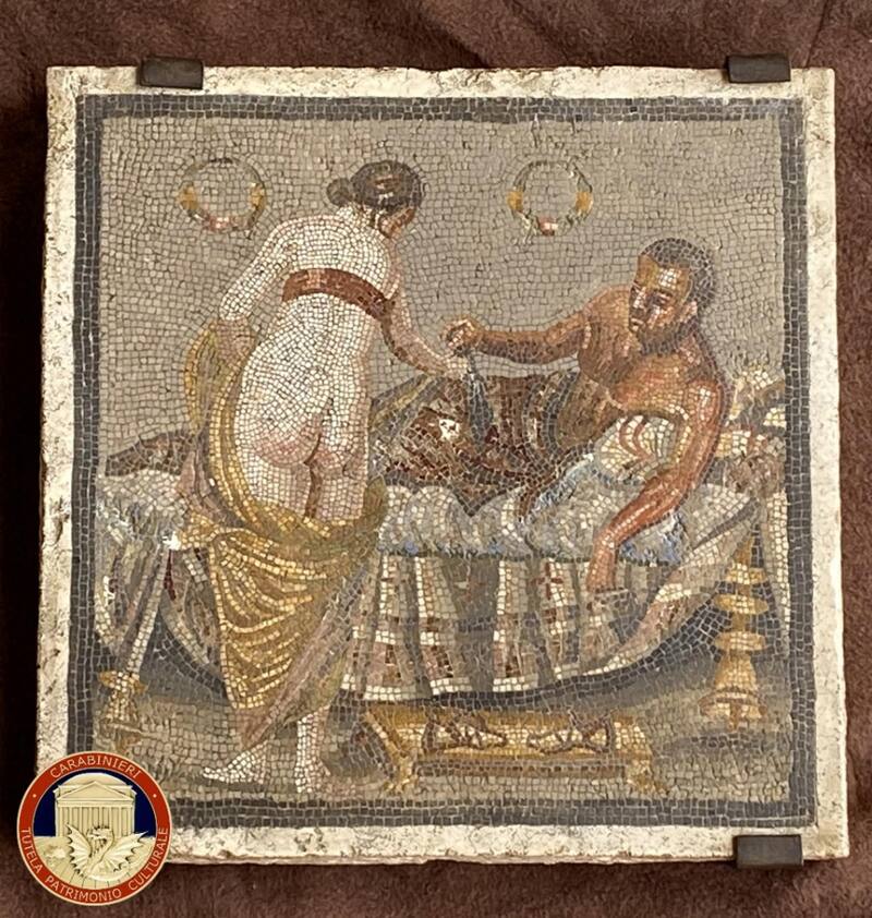 La obra, un panel de mosaico sobre losa de travertino que representa a una pareja de amantes semidesnudos, data de entre el siglo I a.C. y el siglo I d.C., según informaron este martes los Carabineros (policía militarizada italiana).