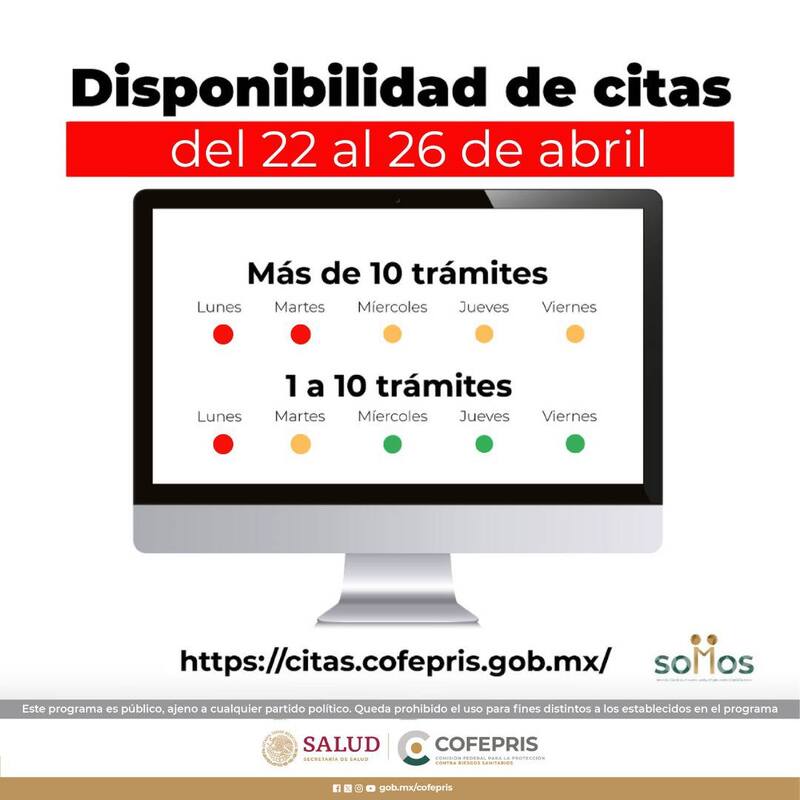 A través de su semáforo de citas, la COFEPRIS llevó a todos los ciudadanos la disponibilidad de citas para esta semana del 22 al 26 de abril, por medio de su Sistema de solicitud de citas para realizar trámites relacionados y vinculados a la Secretaría de Salud.