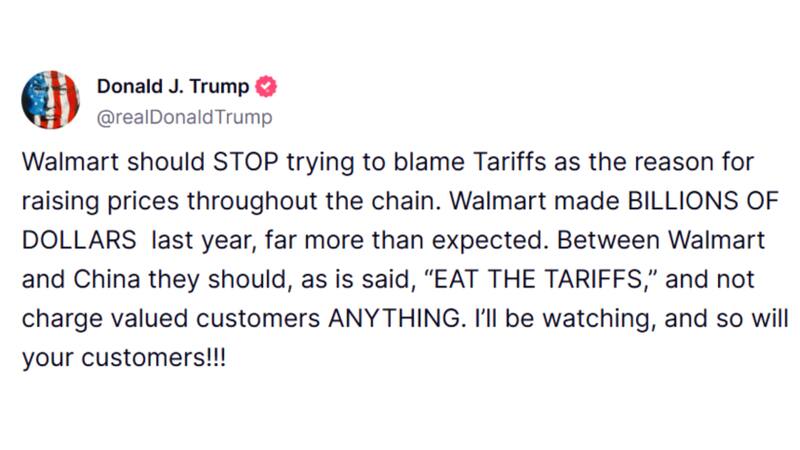 Trump acusó a Walmart y a China de aprovecharse del mercado estadounidense y recalcó que ambos deberían "comerse los aranceles", evitando repercutirlos en los consumidores. Su declaración fue vista como una forma de presionar a las grandes empresas para que no utilicen las medidas arancelarias como justificación para modificar su política de precios.