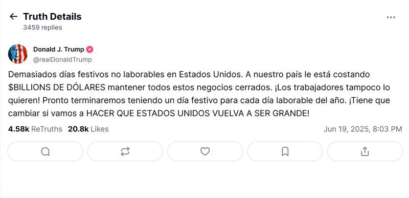 Donald Trump volvió a generar polémica tras lanzar un mensaje desde Truth Social, en el que cuestionó duramente la cantidad de feriados que tiene Estados Unidos.