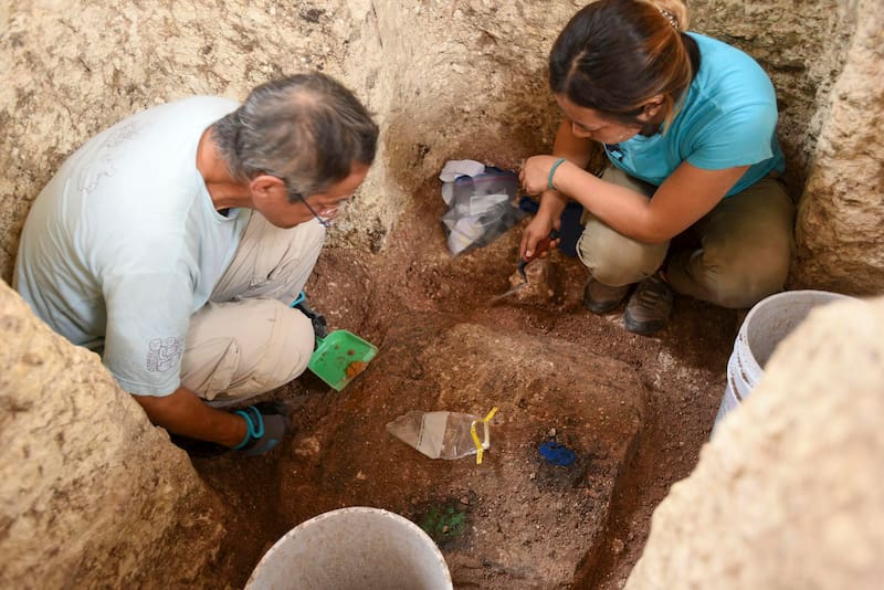 A medida que excavaban más profundamente se fueron encontrando con adornos tallados en jade que reconocieron como representaciones de un cocodrilo, un pájaro y lo que creen que es una mujer dando a luz.