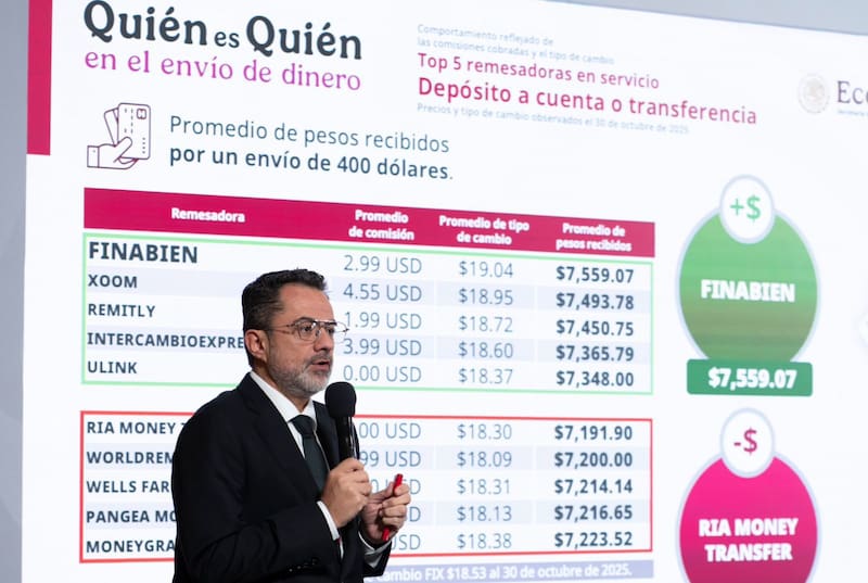 El titular de Profeco aseguró que “Finabien fue la que pagó más en depósito o transferencia, casi 400 pesos más que otras remesadoras”, al comparar los precios observados el 30 de octubre de 2025.