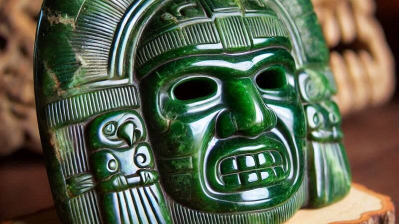 El jade, componente esencial de las máscaras funerarias de los soberanos mayas, se asociaba al agua y se relacionaba con el cielo y el mar primordial de la creación, como símbolo de aliento vital, fertilidad y renacimiento.