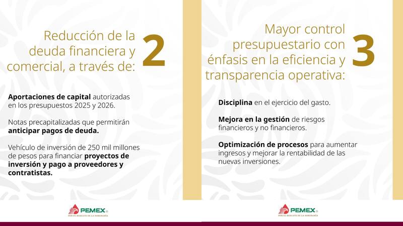 El secretario de Hacienda, Édgar Amador Zamora, añadió que el plan permitirá atender los fuertes vencimientos de deuda en 2025 y 2026. "Con finanzas sanas y capacidad renovada, Pemex tendrá rumbo claro y estabilidad en el largo plazo", aseguró.