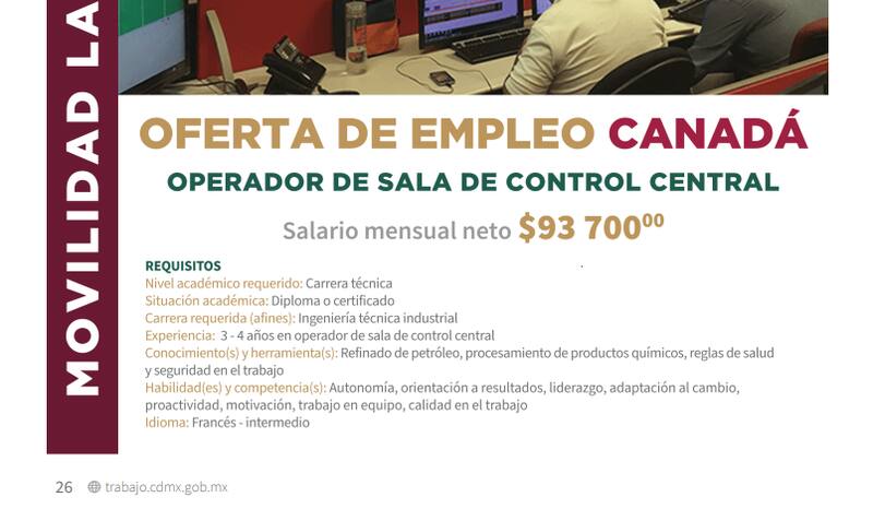 A partir del Programa de Movilidad Laboral, coordinado por los gobiernos federales de México y Canadá en colaboración con la Ciudad de México (CDMX) a través de la Secretaría de Trabajo, se ha ofertado a mexicanos el cargo de Operador de sala de control central.